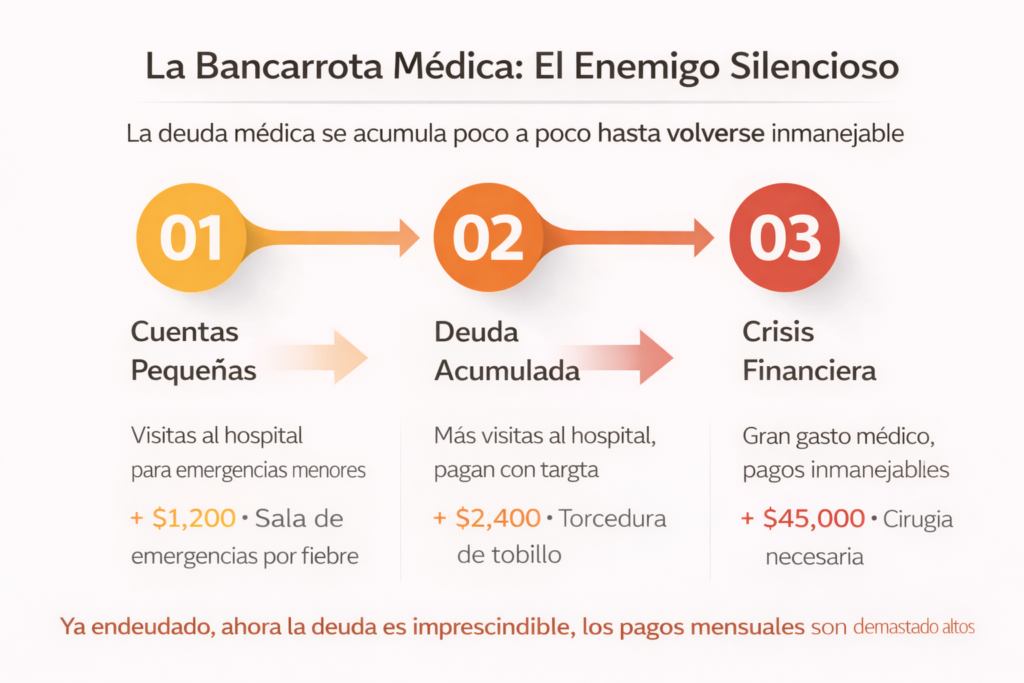 Permíteme contarte cómo funciona típicamente la bancarrota médica, porque no es lo que la mayoría piensa. La gente imagina que es un proceso repentino: te enfermas, llega una cuenta gigante, pierdes todo. Pero la realidad es más cruel y gradual.