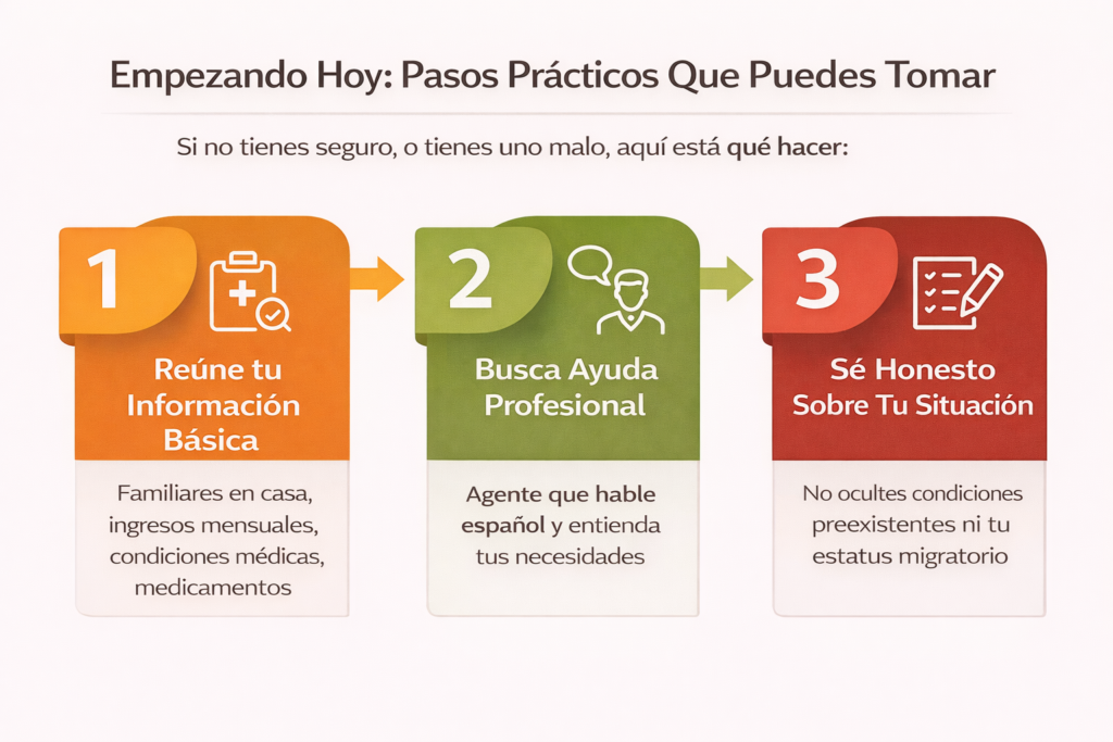Y quinto, actúa ahora. No esperes a que pase algo. La naturaleza del seguro es que lo necesitas antes de que lo necesites. Una vez que estás en el hospital, ya es tarde para conseguir cobertura para esa emergencia.